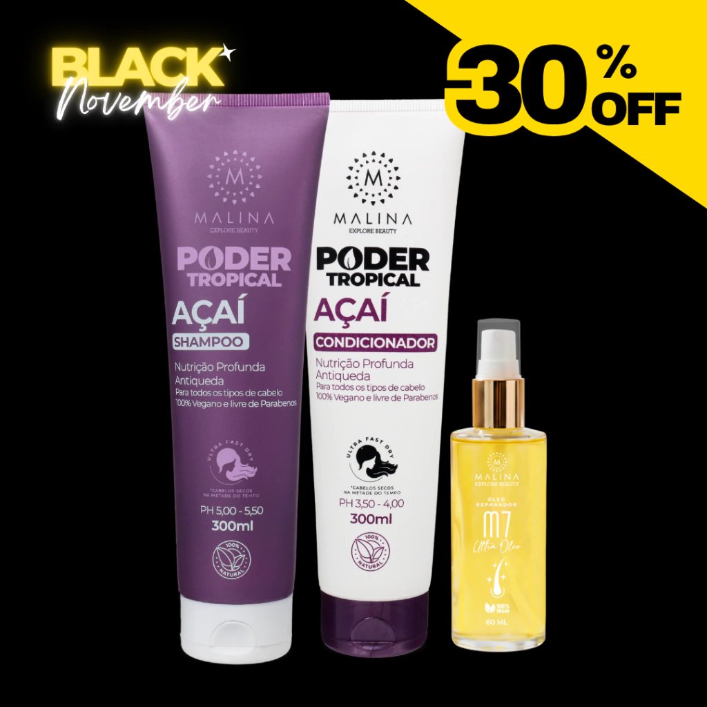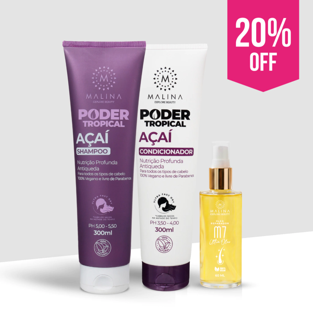 O Kit Poder Tropical Açaí oferece nutrição profunda e proteção contra agressões externas, revitalizando os cabelos com o poder do açaí, enquanto o M7 Ultra Óleo atua na reparação estrutural dos fios, promovendo brilho, maciez e um acabamento impecável.